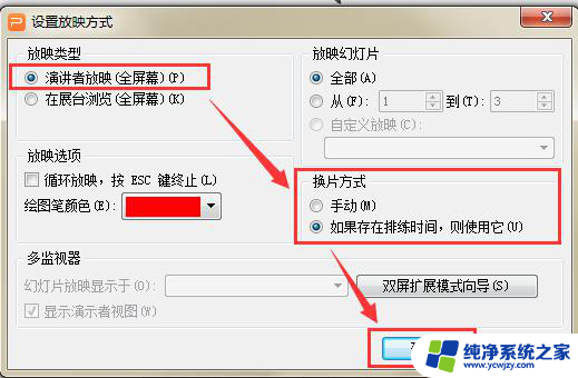 2.设置好排练计时后,点击”幻灯片放映”--“设置放映方式”,放映类型选择“演讲者放映(全屏幕)”,换片方式选择“如果存在排练时间,则使用它”即可。