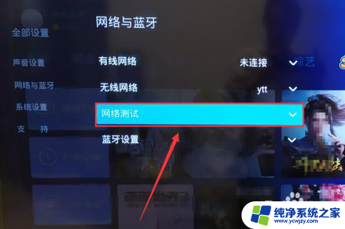 8.返回“网络与蓝牙”页面后,用遥控器把高亮块移动到“网络测试”项上。并按确定键。见下图