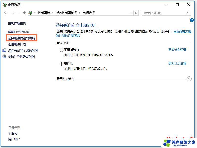 3、进入电源选项界面,点击【选择电源按钮的功能】,