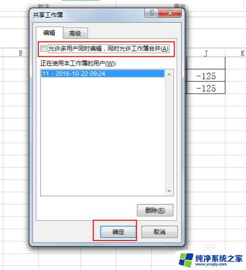 4.允许对多用户进行编辑,同时允许工作簿进行合并去掉钩,确定。