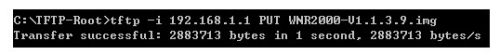 5.8.如果是在Linux系统下,请输入命令:tftp -m binary 192.168.1.1 -c PUT WNR2000-XXXX.img.其中,WNR2000-XXX.img是要传送的固件的Image文件,即“准备工作”中所下载的升级文件的名称。本文所举例中,升级文件名为WNR2000-1.1.3.9.img。