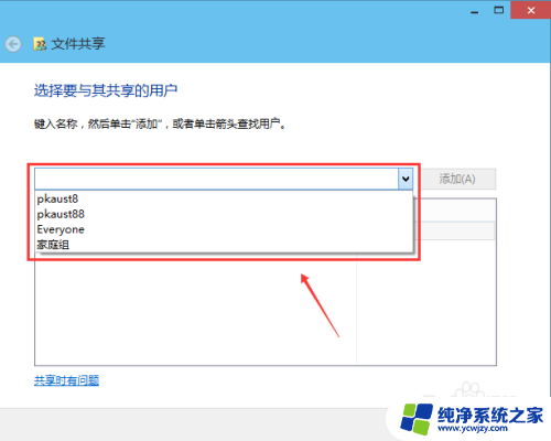 3.点击后,弹出文件共享窗口。点击下面的向下箭头,可以打开下拉共享用列表,如下图所示。