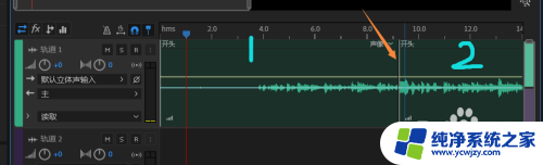 5.在鼠标光标处,用剃刀工具切一下。音频就会分为1、2两部分,如图所示。