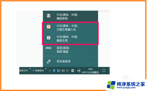 11.我们将万能五笔设置为默认语言以后,再点击系统桌面右下角的语言按纽,可以看到:中文(简体、中国)万能五笔输入法 项调到了最上面。