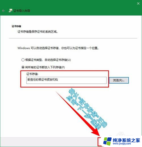 点击浏览选择,在新的弹窗中选中“受信任的根证书颁发机构”。然后点击“确定”。