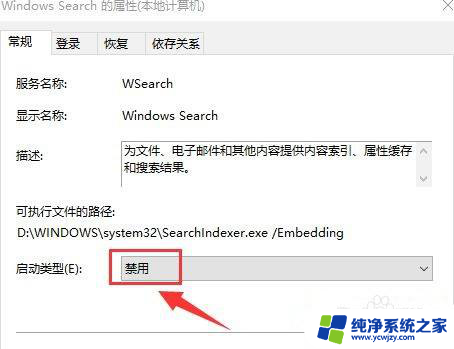 4.双击“widows search”将“启动类型”改为“禁用”即可。