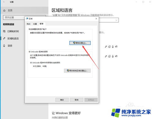 4.进入区域和语言界面后,点击“管理语言设置”。
