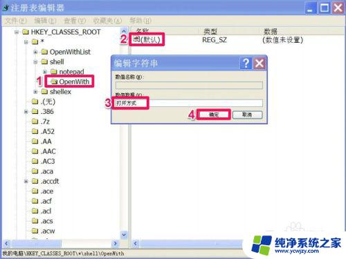 7,然后在OpenWith右侧窗口,双击“默认‘这一项,将”打开方式“写入其值。确定。