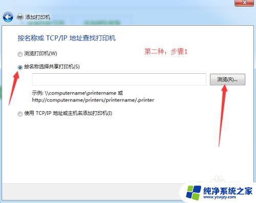 第一种:选择”浏览打印机“,进入下一步,双击选择连接打印机的pc机,选择打印机设备,连接成功,完成。