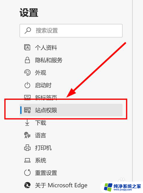3.在设置界面中,点击左边菜单中的“站点权限”